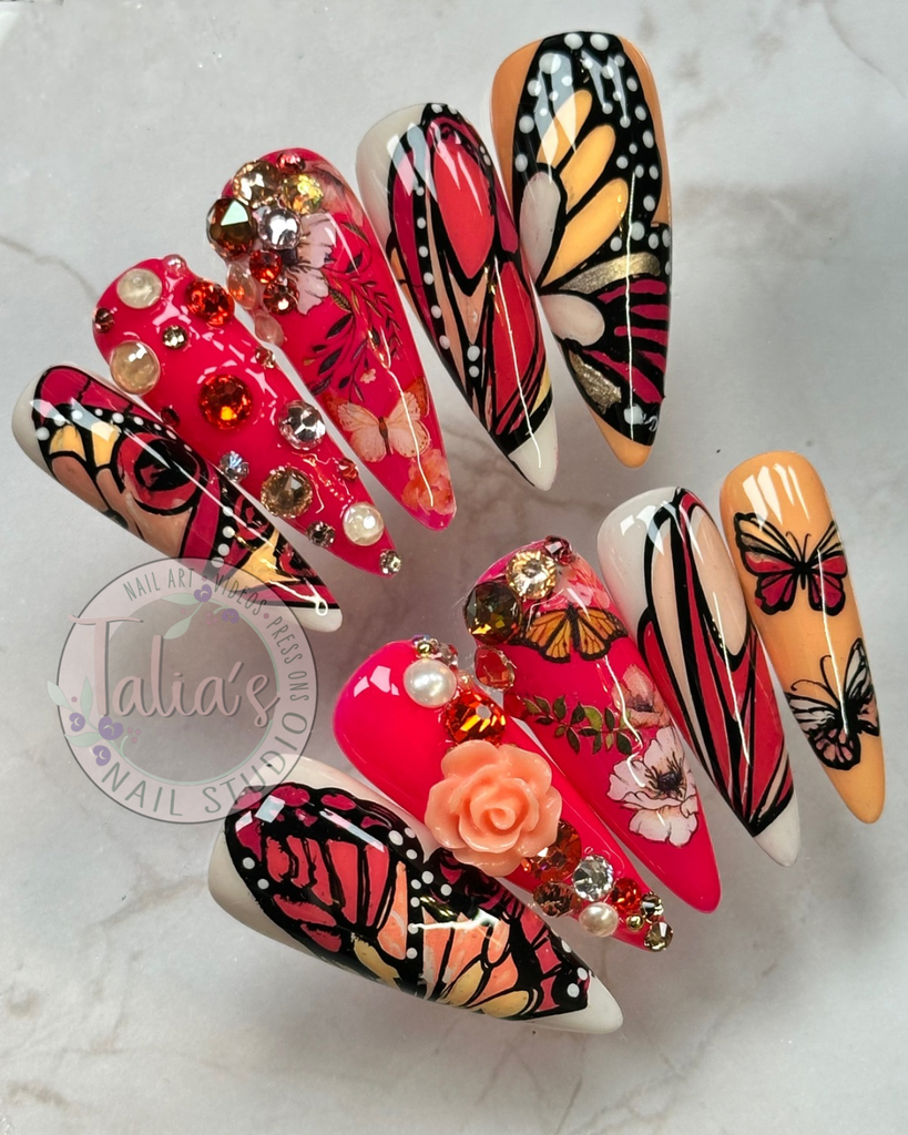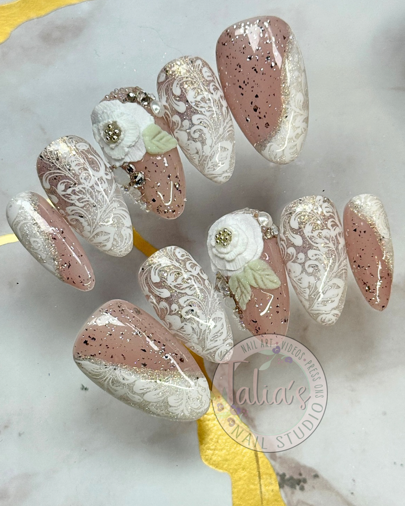• Trend-driven nail art with florals, chrome, glitter, 3D, and more