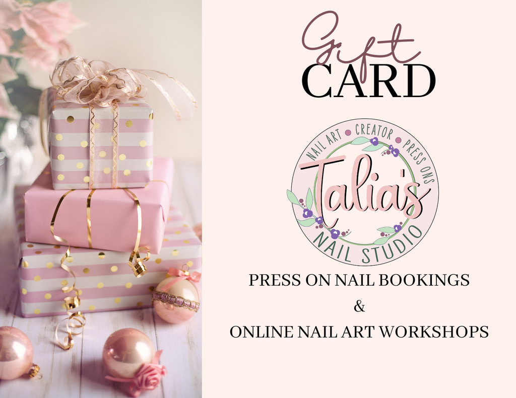 Give the gift of creativity and self-care with a Talia’s Nail Studio digital gift card! Perfect for any nail lover, this gift card can be used toward online nail art workshops and custom press-on nail bookings.