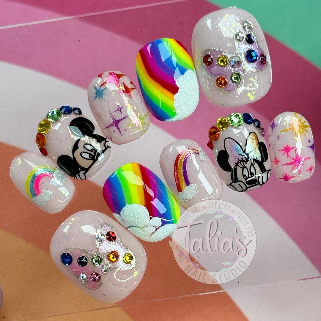 Celebrate magic, color, and whimsy with this Rainbow Mickey inspired press-on nail set. Featuring watercolor backgrounds, rainbow crystal accents, and playful Mickey designs, these nails are perfect for Disney fans, theme park visits, Pride celebrations, or anyone who loves fun, colorful nail art.