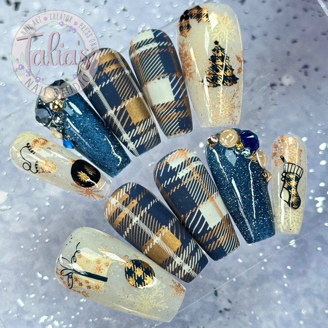 Add a festive touch to your manicure this winter with this hand-painted press-on nail set. Featuring blue and gold plaid patterns, charming Christmas-themed accents, and sparkling crystal embellishments, these nails are perfect for holiday parties, winter events, or anyone wanting a stylish seasonal manicure.